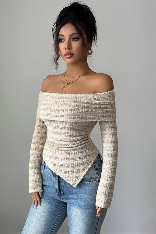 Women’s Light Apricot-colored Long-sleeved Off-shoulder T-shirt